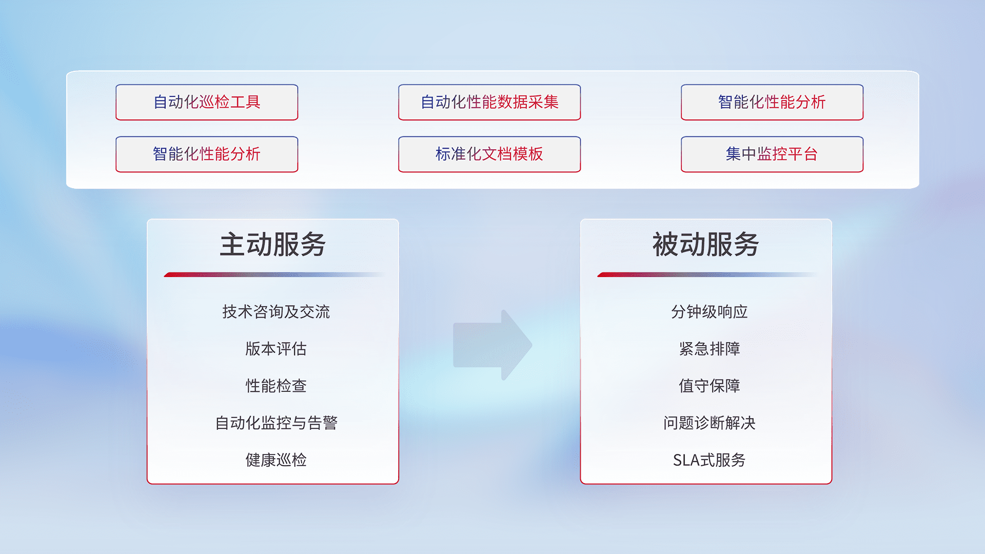 智能化工具和标准化文档,,保障服务质量,,,,提供主动服务(包含技术咨询、、、、版本评估、、性能检查、、、、自动化监控与告警、、健康巡检)和被动服务包含(分钟级响应、、、紧急排障、、、、值守保障、、、问题诊断解决、、、SLA服务)。。。。